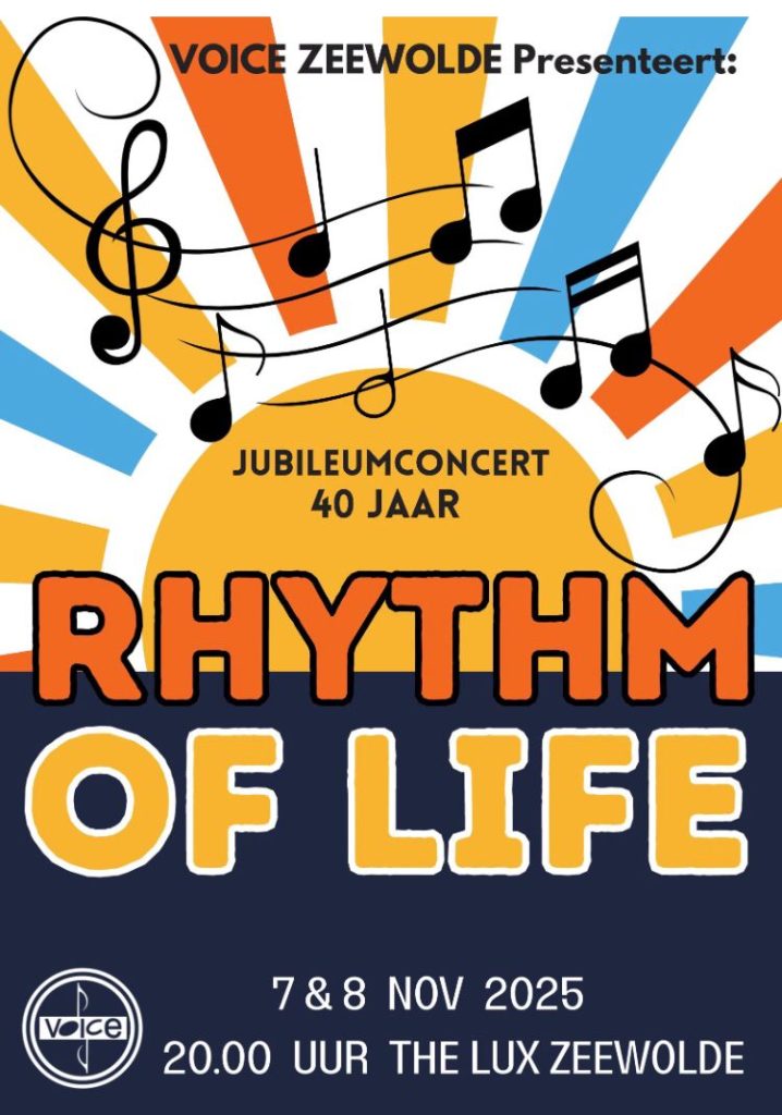Eindelijk mogen we het bekend maken: op vrijdag 7 en zaterdag 8 november 2025 (20u) gaan we ons 40-jarige jubileum groots vieren met de show ‘RHYTHM OF LIFE’ In dit concert gaan we op muzikale wijze terugblikken op 40 jaar VOJZ/VOICE. Oftewel een voorstelling over vier decennia zangplezier, lief & leed en onvergetelijke dirigenten. Verheug je alvast op veel nieuw toepasselijk repertoire op de planken van theater The Lux. En natuurlijk een paar overbekende nummers in een vernieuwd muzikaal jasje. Iedereen is hierbij van harte uitgenodigd ons jubileum samen met ons te vieren! Blok 7 en/of 8 november 2025 daarom alvast in je agenda. De kaartverkoop start na de zomervakantie. Houd de socials in de gaten!